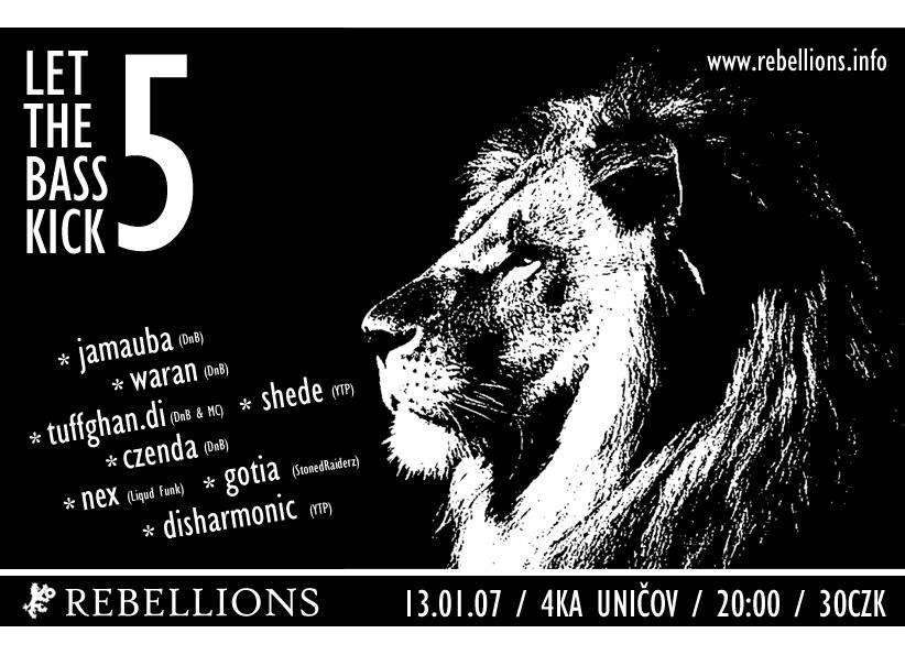 Jednoznačně nejdelší a nejvíce navštívená Let The Bass Kick skončila nakonec moc dobře a od celého kolektivu Rebellions putuje poděkování všem zúčastněným fanouškům a pozvaným DJ´s jenž nás přišli podpořit čímž vytvořili neopakovatelnou atmosféru oslavy už rozběhnutého roku 2007 v naši režii. Takže všem do nového roku hodně zdraví, štěstí a dobré nálady a uvidíme se zase na další akci.
